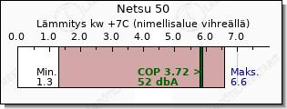 Laitteiden minimi ja maksimitehot palkkeina, jossa nk. nimellisteho hyötysuhteen ja äänitason kera on korostettuna vihreänä kaistana.