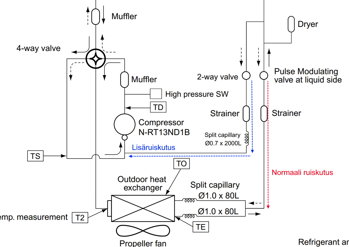 Normaali kylmäpiirin ratkaisu aiheuttaa kompressorin lämpötilan kohoamista pakkasen kiristyessä paine-eron kasvaessa sisä ja ulkoyksikön välillä.