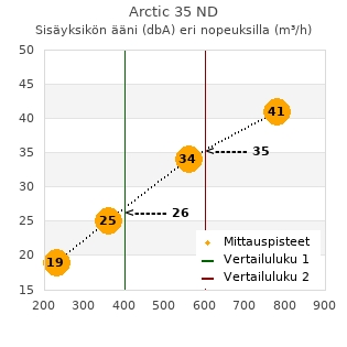 - Pisteiden lukemat ovat valmistajan ilmoittamia ja mitataan kaiuttomassa tilassa, tyypillisesti metrin päästä sisäyksiköstä. Leikkauspisteen kehystetty lukema on laskennallinen (ei mitattu).