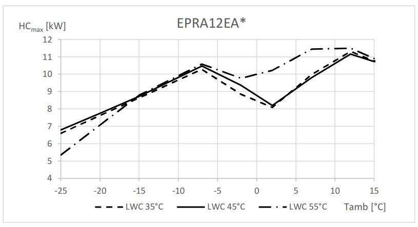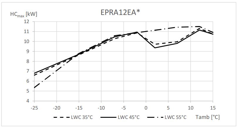 | Mitoittava teho, patterilämmitys Energiatehokkuusmittauksien (EN 14825) rakenneteho pRated. Veden lämpötila 55C, ulkolämpötila -10C |