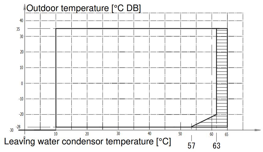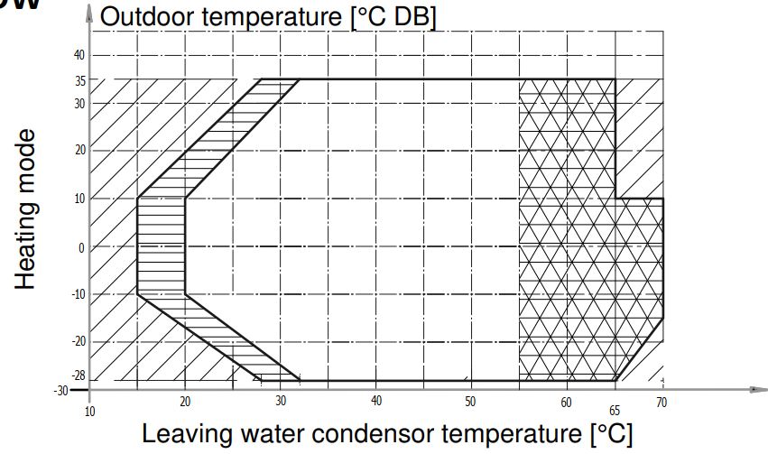 Toiminta-alue on riippuvainen ulkolämpötilasta ja asetuslämpötilasta. Kuvassa valkoinen alue on kompressorikäytöllä ja varjostukset rajoitettua käyttöä.