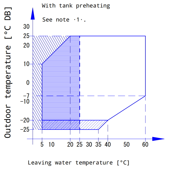 Toiminta-alue on riippuvainen ulkolämpötilasta ja lähtevän veden lämpötilasta. Kuvassa valkoinen alue on kompressorikäytöllä ja varjostukset rajoitettua käyttöä.
