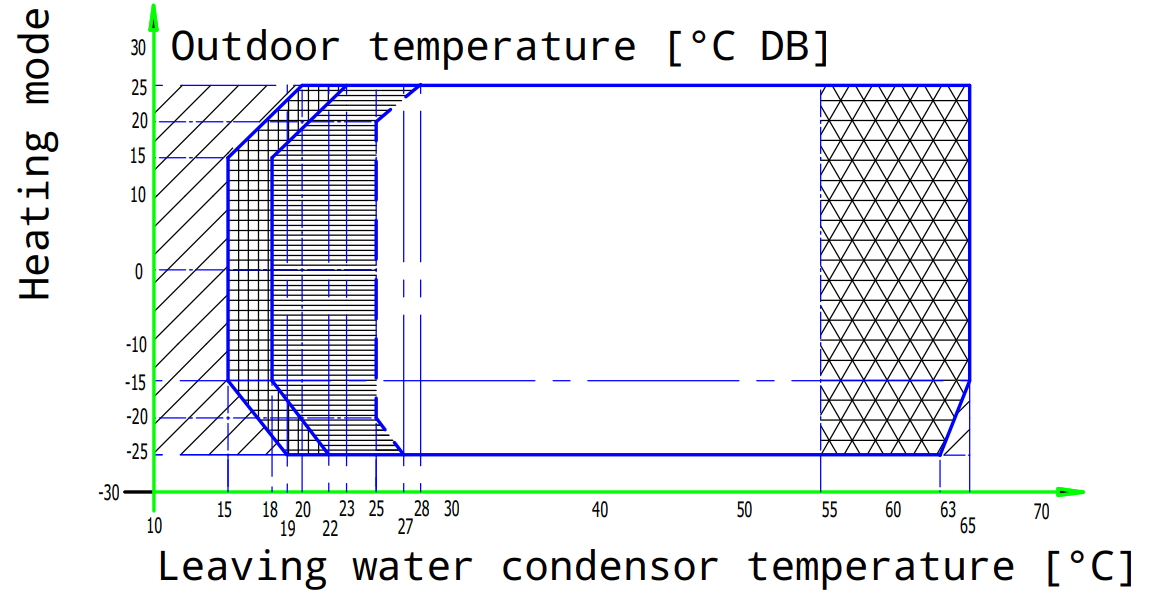 Toiminta-alue on riippuvainen ulkolämpötilasta ja asetuslämpötilasta. Kuvassa valkoinen alue on kompressorikäytöllä ja varjostukset rajoitettua käyttöä.